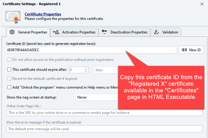 •Generate a Registration Key: For users without an Internet connection, if "Manual Activation" is enabled in HTML Executable, they can still register your publication or ebook. They'll provide you with a system ID, which you can input to generate a registration key for them.