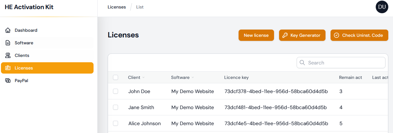 👉 You can create licenses manually with the Licenses page or you can automate the process with PayPal payments for instance.