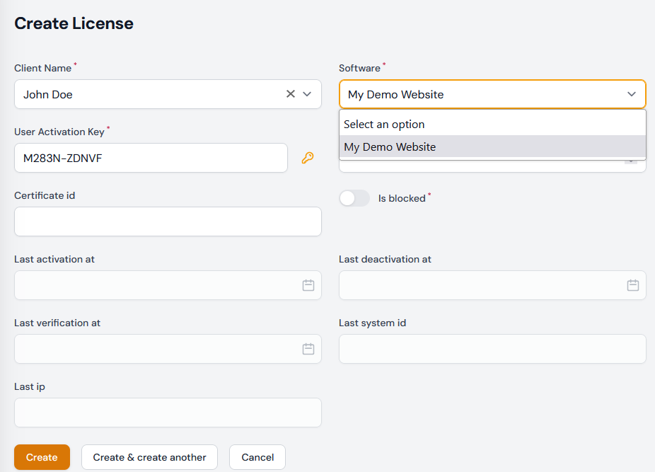 •Edit License: This is akin to the 'Add License' action but with more fields. Here, you can block users, especially useful in cases of refunds. This section also provides insights into the user's activity - their last activation, deactivation, validation dates, and their last recorded IP.
