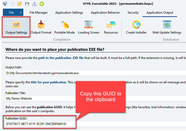 1.👉 Publication GUID: The GUID (Global Unique Identifier) is a unique code associated with each publication or e-book. This identifier ensures that the correct publication is referenced during the activation process. You'll need to take the GUID provided by the corresponding field in your HTML Executable project and input it into the web application. The GUID of your publication can be found in HTML Executable by going to "Application Output" > "Output Settings":