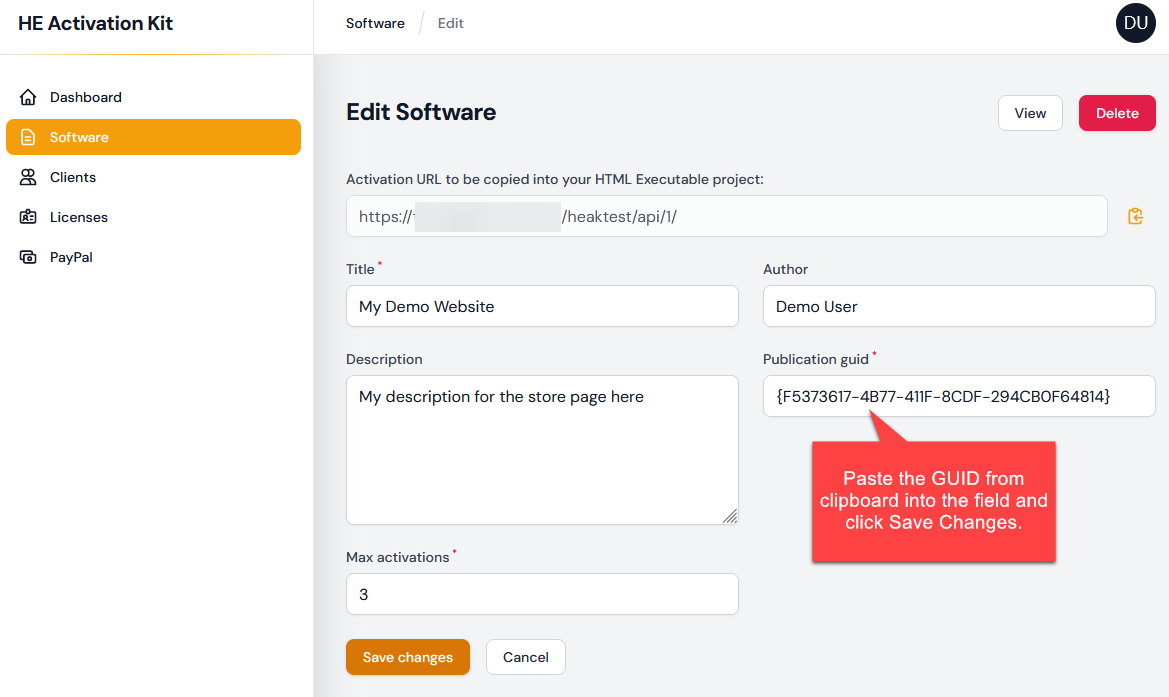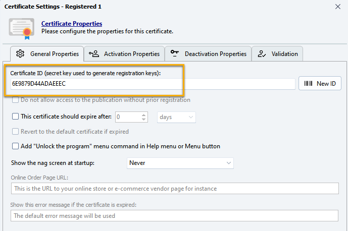 Activation URL to be copied into your HTML Executable project: This is the unique URL that needs to be integrated into your HTML Executable project. It serves as the endpoint for the online activation process of your software or publication (see below). You can easily copy it to the clipboard with the dedicated button.