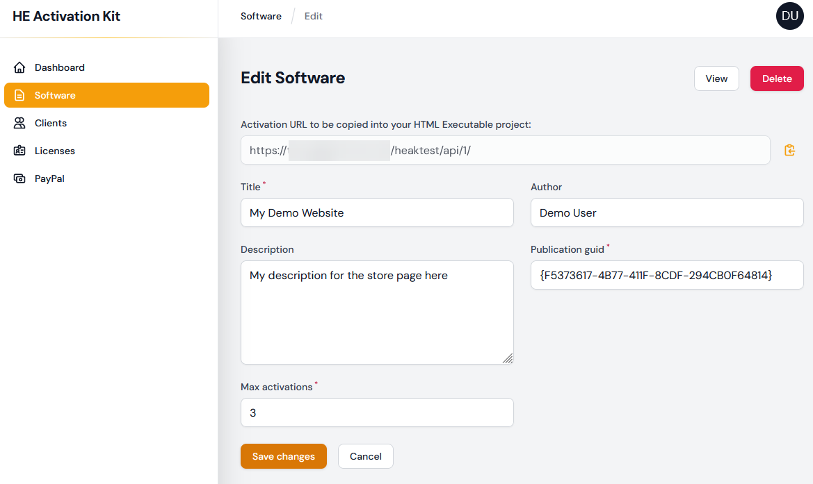 This page lists all of the software managed through the Activation Kit. Click New Software to add a new one, View to see its properties or Edit to modify one.
