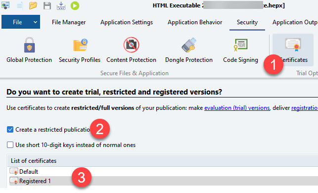 1) Edit the HEPX project file of your publication with HTML Executable 2023. Go to "Security > Certificates":