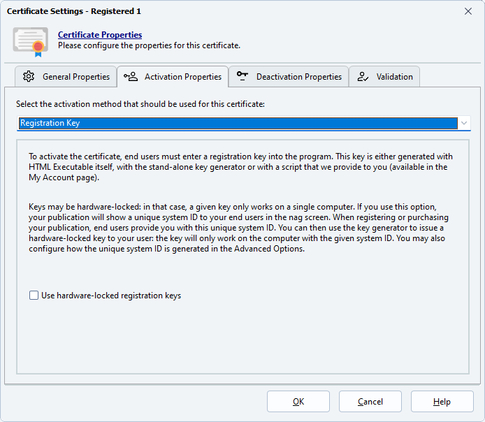 HTML Executable offers two activation methods to activate a certificate. To choose a method, go to the Certificate Manager, double-click on a certificate and choose the "Activation Properties" tab as shown below: