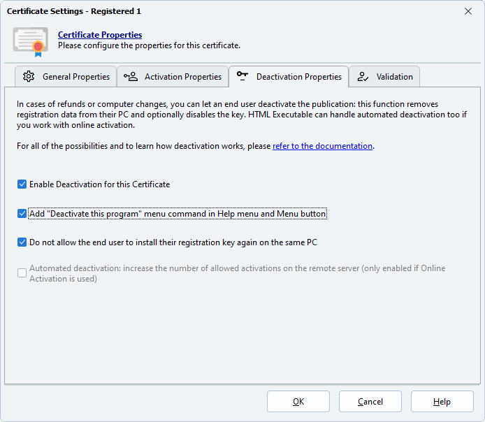 ✔ To enable the deactivation process for your ebook or publication, navigate to the Certificate Manager, double-click on a certificate, and select the "Deactivation Properties" tab: