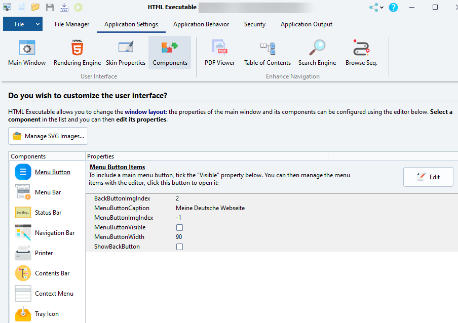 HTML Executable lets you create modern and complex user interfaces for your ebooks and HTML applications with its visual editor. To edit the interface of your application, go to Application Settings => Components.