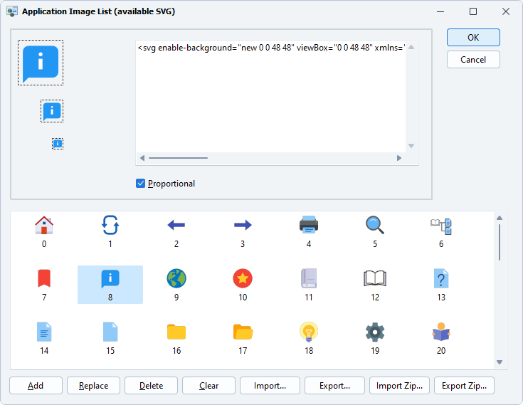 The HTML Executable SVG Image Manager is a versatile tool for managing all SVG images and icons that can be used in different parts of a compiled HTML application or ebook. This includes, but is not limited to, buttons on ribbons or toolbar icons (Navigation Bar) or items in the Table of Contents. You can access it thanks to the Manage SVG Images button in Application Settings => Components.
