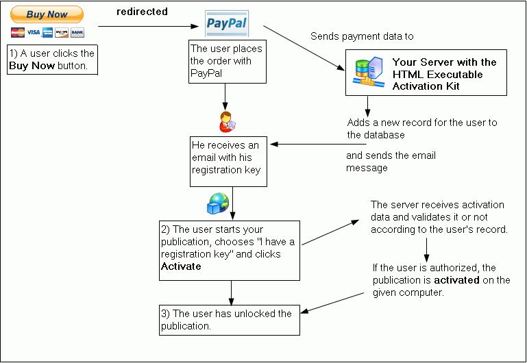 1)The user places an order for your publication via your authorized reseller (e.g., PayPal). The order details, along with user information, are sent to the activation server, which is configured with the HTML Executable Activation Kit or our Protect Ebook .net activation service. An account is created in the database, and a unique activation key is generated and sent to the end user (e.g., via email).