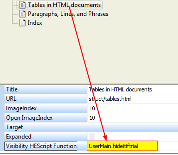 Close the script editor, go to the Table of Contents page and choose the TOC item you want. Enter the reference to the script function: `UserMain.HideItIfTrial` or select it with the "..." button. Press Enter to save changes.