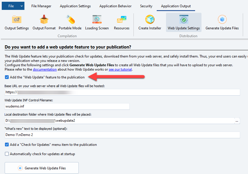 Ø"What's new" text: (Optional) The text to display to your users in the Web Update Wizard when a new upgrade is available.