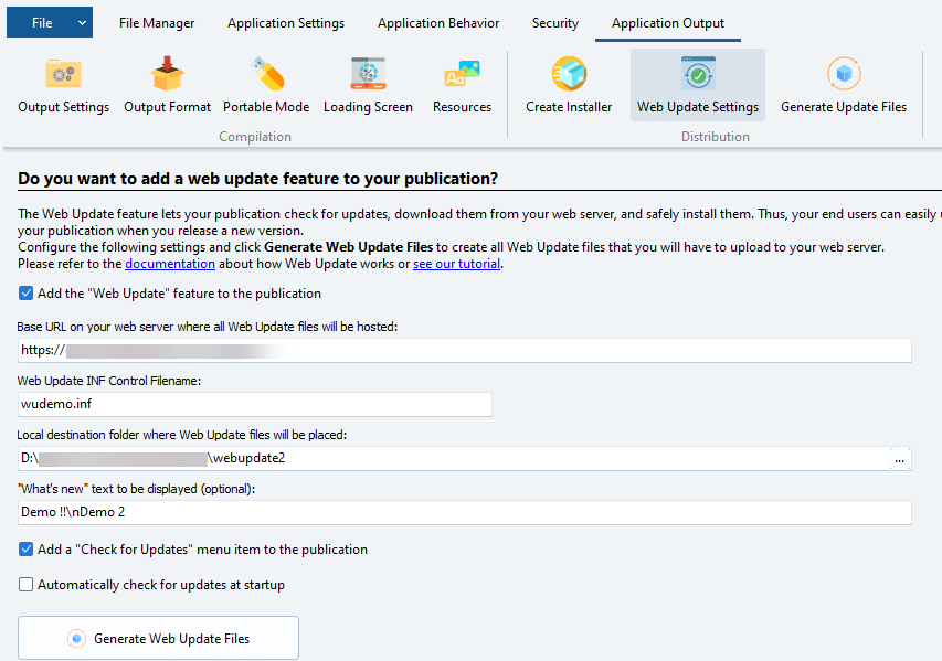 ØBase URL: The location on your web server where all Web Update files will be hosted. This should be an HTTP/HTTPS URL where all update files (control and CAB files) are available for download. For example, `https://www.yourwebsite.com/myfolder`